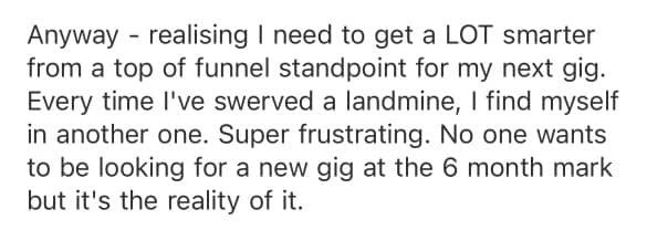 Let me tell you a bit more about Katie, the woman I worked with who recently signed a deal for $230,000 + a bunch of RSUs at Harvey. If you’re even vaguely aware of the game, you should be aware that Harvey isn’t the average startup to work for. It’s like joining Databricks in 2019. Stripe in 2014. It's resume gold. I could go on. But let’s get back to Katie. She emailed me on June 12th of this year asking a few questions about how to find good companies to work for. I’ll discuss this in more detail another time, but she was following the procedure I see most people in tech/sales advocating for. It’s a fine on paper, but it’s not nearly enough to ensure you land at a great company. And as Katie found out, it’s not even enough to avoid a disastrous one. Even though she was performing well and hitting her numbers, her company’s founder was a startup CEO bro straight out of a bad reality TV show. I’m treading lightly to protect her privacy… but… she was basically asked to do a book report on a Brené Brown book. You can’t make this stuff up (odds this CEO is one of those weirdos on LinkedIn?) Anyway, by the time she reached out to me, she knew she needed a totally different approach to company selection. Here she is in her own words: I share this for one reason. Yes, Katie is a good rep who was hitting her numbers. That’s one part of the equation I can’t do for you. But even with talent and good numbers, she still found herself in a crappy situation. It happens. And it’s not your fault. Companies put a lot of thought and effort into presenting themselves as a perfect place to work during interviews. As a rep who’s only seen the inside of a few companies over your career, it’s hard to know the difference from the outside. That’s the gap Katie wanted to close by working with me. And so we did. In under 50 days, she landed a $230k + RSU package at Harvey. If you want to work with me for 6 weeks to make a big move like Katie’s, reply to this email and we’ll talk I’ll be back tomorrow with more about Katie’s story and the next cohort. Talk soon, Sam P.S. I can’t repeat this enough. Katie is a sharp rep. From her first set of questions on June 12th to today, she’s been on the ball and extremely intentional and proactive. If you’re the same, I want to help you create a huge outcome for yourself. Hit reply and let’s talk. |